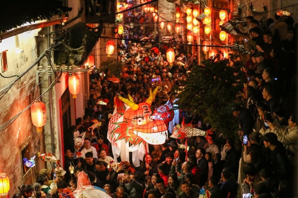 2024年2月13日,安徽黃山,歙縣北岸鎮(zhèn)千年古村瞻淇村熱鬧非凡,一年一度的嬉魚燈民俗活動上演。瞻淇村嬉魚燈是一項傳統(tǒng)的民俗活動,歷史悠久,相傳起源于宋朝,延續(xù)至今已有800多年的歷史。