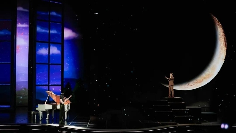 歌詞迅速修改到位,但舞臺(tái)的呈現(xiàn)成了讓人反復(fù)琢磨的問題。如何表現(xiàn)“想見卻無法相見”的感覺?如何營造恰到好處的絲絲愁緒?從初次彩排時(shí)用秋千承載思念,到二排時(shí)改用燈光打造“兩個(gè)空間”,幾番嘗試總讓人感覺“還差點(diǎn)兒味道”。最后臺(tái)長提議,用“剪影”去暈染思念的情緒,可以考慮用蘇軾的“人有悲歡離合,月有陰晴圓缺”的意境,以月亮為背景。這一下子打開了大家的思路。