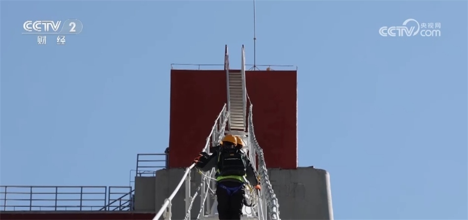 經(jīng)過30分鐘左右的攀爬,他們到達(dá)了整座大橋最高的位置,開始檢查鞍罩。鞍罩就是像馬鞍一樣的罩子,主要是為了保護(hù)邊跨和主跨的連接部位,鞍罩內(nèi)還裝有大橋健康檢測系統(tǒng)和除濕系統(tǒng),實(shí)時(shí)監(jiān)控大橋的健康狀態(tài)。