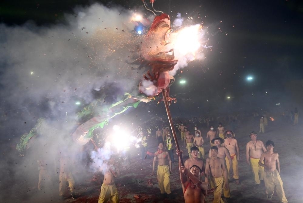 記者20日傍晚時分在賓陽縣看到,舞龍活動正式開始。舞龍人有的頭戴藤帽、身著傳統(tǒng)的黃色舞龍服;有的則赤膊上陣,在鞭炮聲中勇敢地舞龍。