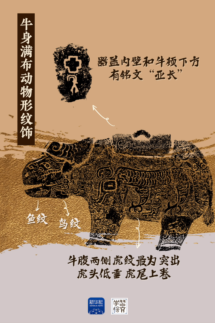 亞長牛尊是截至目前殷墟發(fā)現(xiàn)的唯一一件牛形青銅容器?!皝啞笔俏涔俚姆Q謂,“長”是家族姓氏,墓主人亞長是商王朝南部“長”國的部落首領(lǐng)。