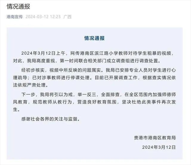·廣西通報“小學(xué)教師扇打拖拽學(xué)生”:屬實,對涉事教師停課處理。