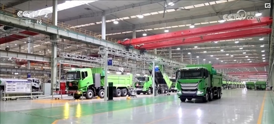 在山東濟(jì)南一家重卡生產(chǎn)企業(yè)的總裝車間里,貨運(yùn)機(jī)器人將重卡的車架依次傳送到各工作站,工人熟練地將發(fā)動(dòng)機(jī)、散熱器、輪胎等零件加裝到車架上。工作人員介紹,一輛重卡從接到訂單開始排產(chǎn)到交付客戶僅需五六天。