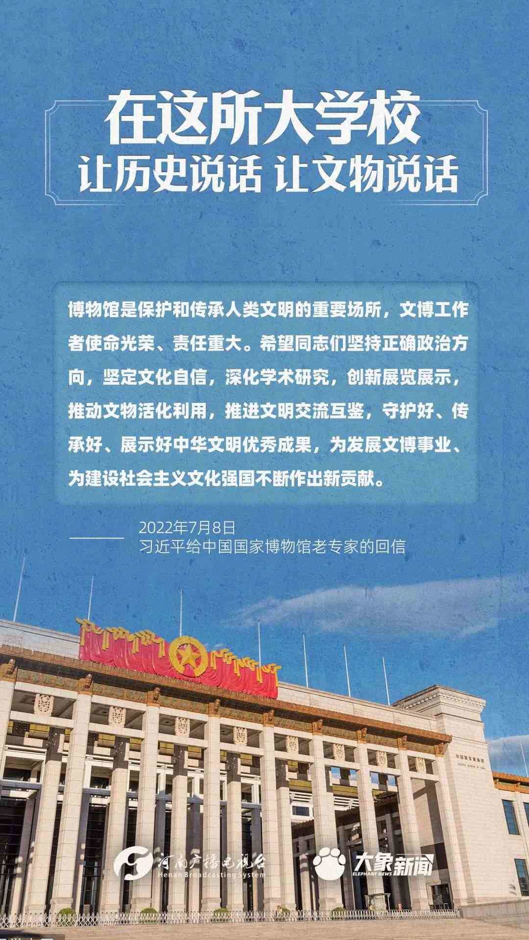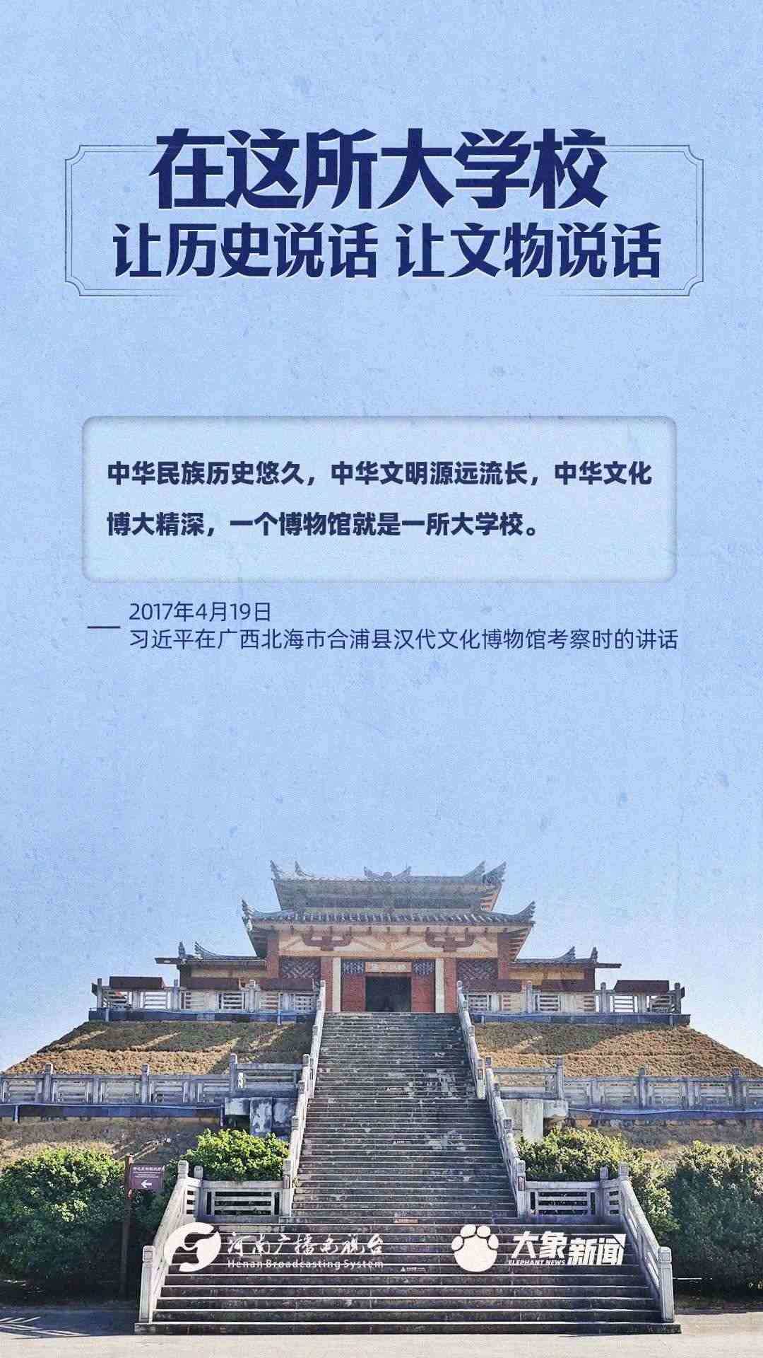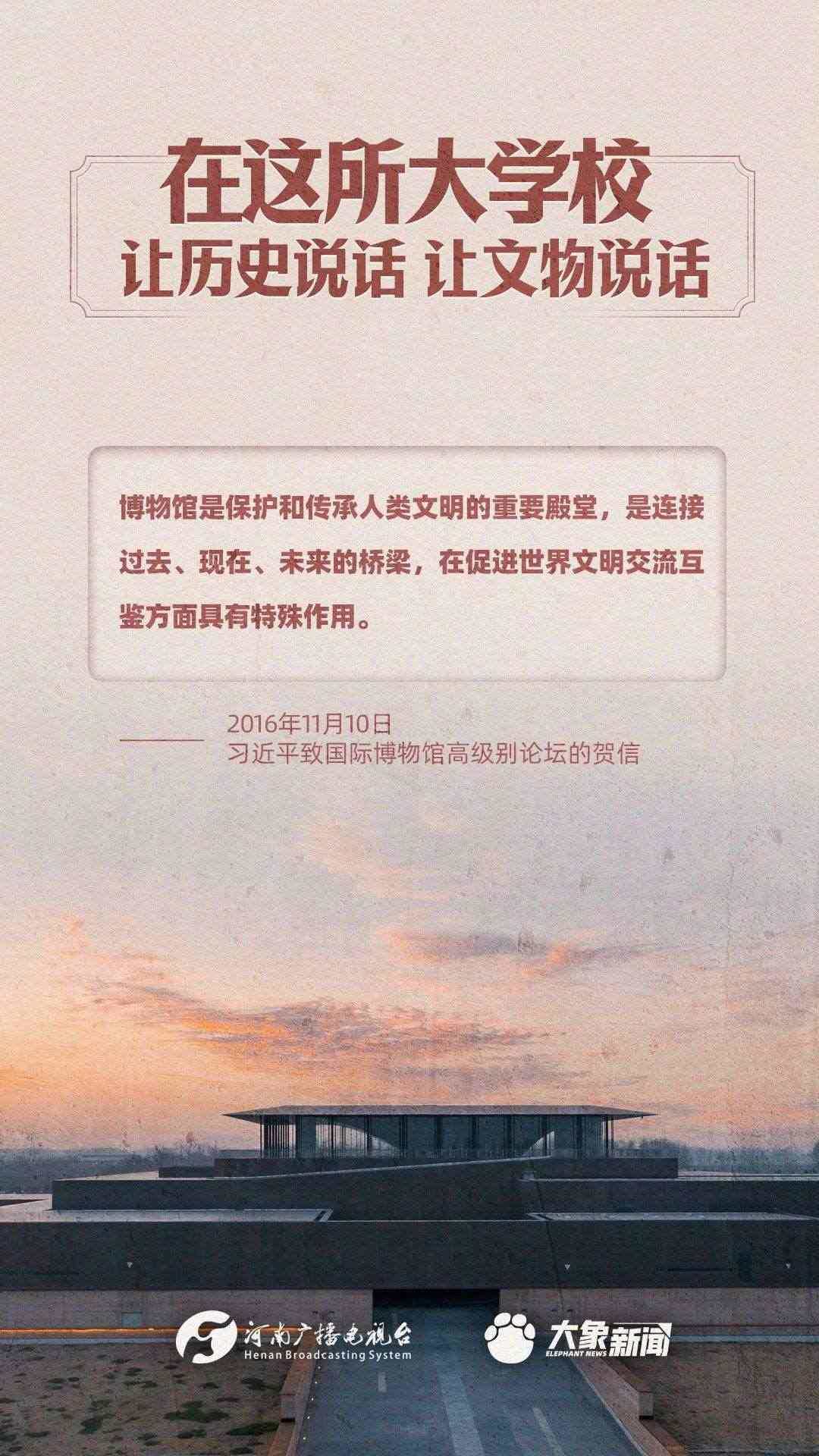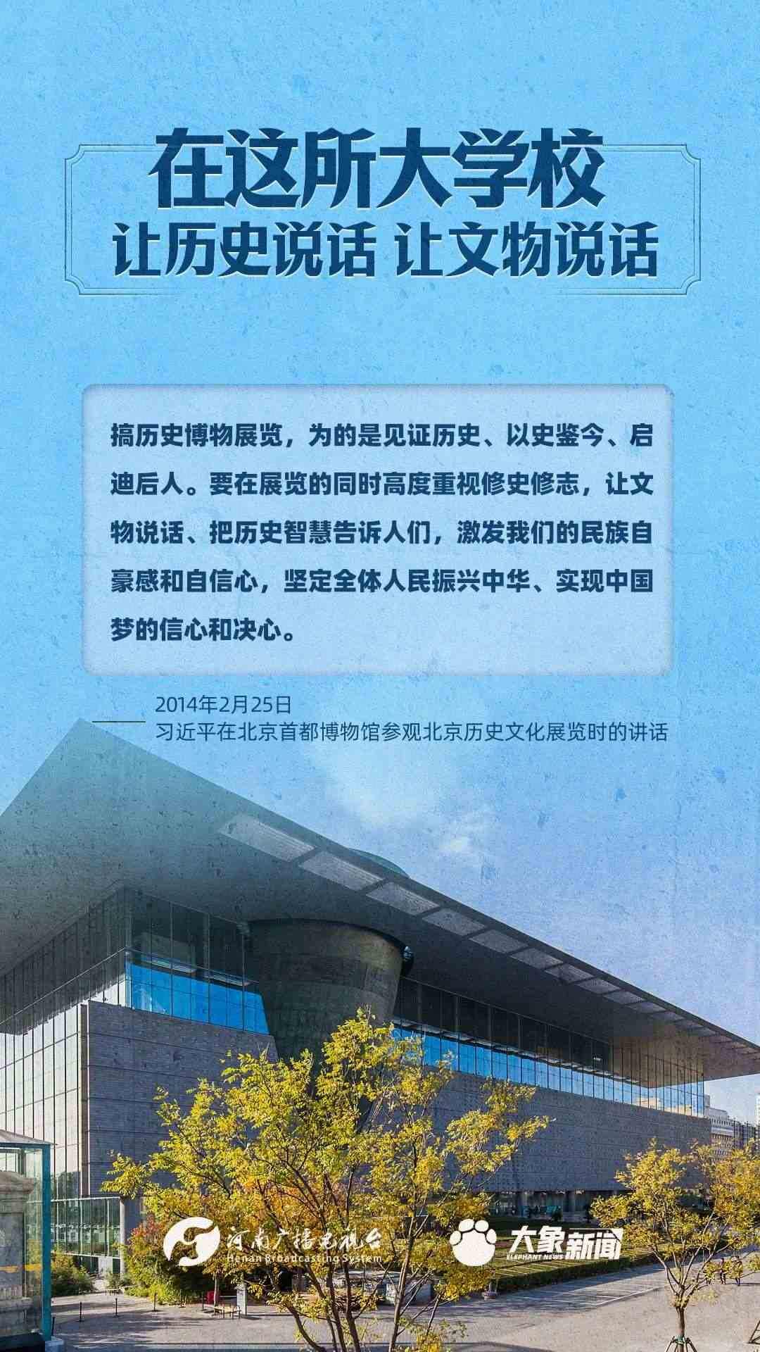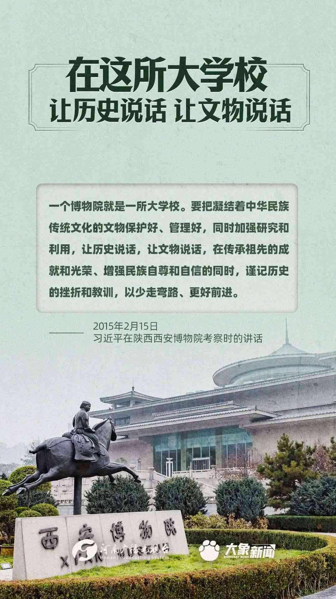 習(xí)近平總書記一直高度重視博物館工作,多次作出重要講話,強(qiáng)調(diào)“一個(gè)博物院就是一所大學(xué)?!保赋觥白寶v史說話,讓文物說話”,要求“守護(hù)好、傳承好、展示好中華文明優(yōu)秀成果”等等,金句連連。大象新聞進(jìn)行了認(rèn)真梳理,邀您一起學(xué)習(xí)。