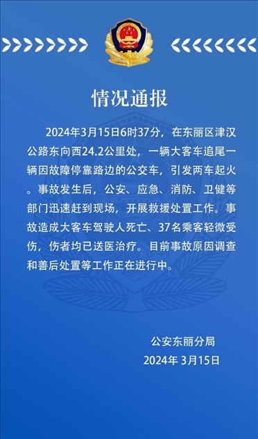 ·天津一輛大客車(chē)追尾一輛因故障??柯愤叺墓卉?chē),引發(fā)兩車(chē)起火,事故造成大客車(chē)駕駛?cè)怂劳觥?7名乘客輕微受傷。