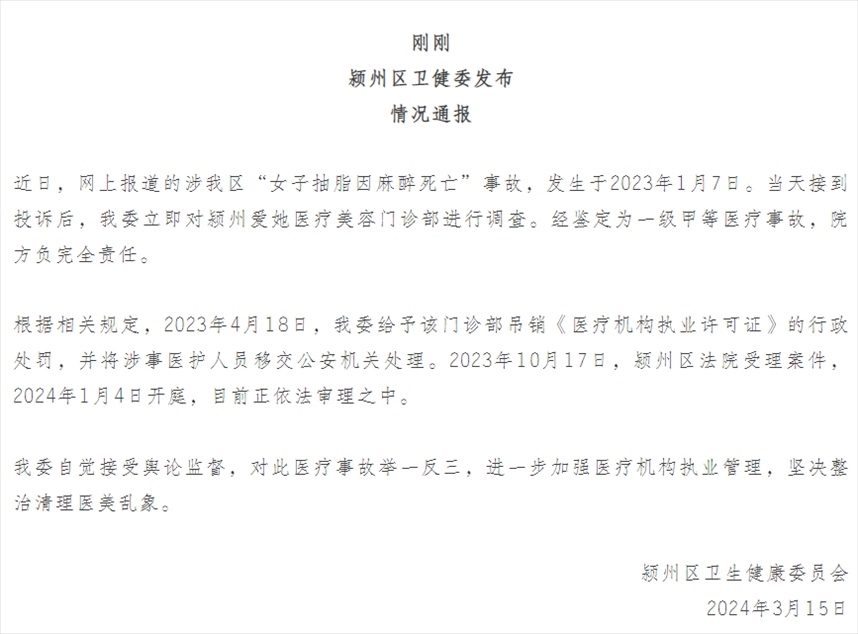 ·安徽阜陽(yáng)一女子抽脂因麻醉死亡,官方通報(bào)。