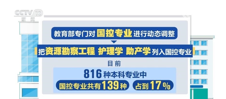 此次教育部專門對國控專業(yè)進行了動態(tài)調整,把資源勘察工程、護理學、助產學列入了國控專業(yè)。目前,816種本科專業(yè)中,國控專業(yè)共有139種,占到17%。未來,國控專業(yè)范圍還將進行“有進有出”的動態(tài)調整。