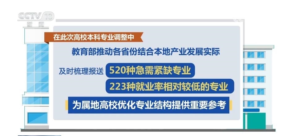 據(jù)介紹,在本次高校專業(yè)調整中,教育部推動各省份結合本地產業(yè)發(fā)展實際,及時梳理報送了520種急需緊缺專業(yè)和223種就業(yè)率相對較低的專業(yè),為屬地高校優(yōu)化專業(yè)結構提供重要參考。