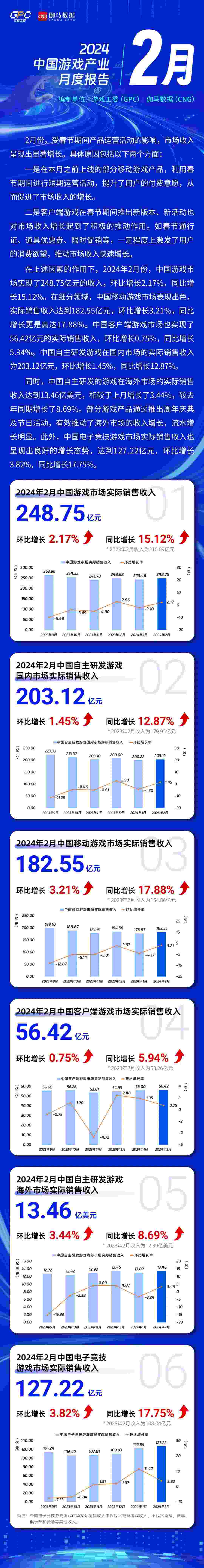 央視網(wǎng)消息:3月20日,據(jù)中國音數(shù)協(xié)游戲工委官微消息,2024年2月中國游戲產(chǎn)業(yè)月度報(bào)告發(fā)布。報(bào)告顯示,2024年2月份,中國游戲市場實(shí)現(xiàn)了248.75億元的收入,環(huán)比增長2.17%,同比增長15.12%。在細(xì)分領(lǐng)域,中國移動(dòng)游戲市場表現(xiàn)出色,實(shí)際銷售收入達(dá)到182.55億元,環(huán)比增長3.21%,同比增長更是高達(dá)17.88%。中國客戶端游戲市場也實(shí)現(xiàn)了56.42億元的實(shí)際銷售收入,環(huán)比增長0.75%,同比增長5.94%。中國自主研發(fā)游戲在國內(nèi)市場的實(shí)際銷售收入為203.12億元,環(huán)比增長1.45%,同比增長12.87%。