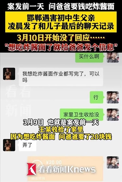 ·3月20日凌晨,邯鄲遇害初中生王某的父親發(fā)布了和兒子的聊天記錄。案發(fā)前一天,王某收拾了家里,因?yàn)橄氤哉ㄡu面,問(wèn)爸爸要了20塊錢。