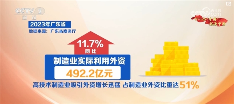 廣東省商務(wù)廳數(shù)據(jù)顯示,2023年全省新設(shè)制造業(yè)外資企業(yè)1078家,同比增長29.9%;制造業(yè)實際利用外資492.2億元,同比增長11.7%。其中,高技術(shù)制造業(yè)吸引外資增長迅猛,占制造業(yè)外資比重達51%。