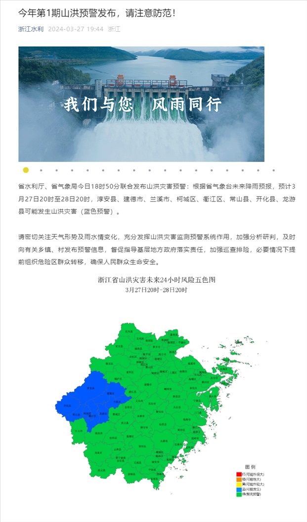 央視網(wǎng)消息:據(jù)“浙江水利”公眾號(hào)消息,浙江省水利廳、浙江省氣象局今日18時(shí)50分聯(lián)合發(fā)布山洪災(zāi)害預(yù)警:根據(jù)省氣象臺(tái)未來(lái)降雨預(yù)報(bào),預(yù)計(jì)3月27日20時(shí)至28日20時(shí),淳安縣、建德市、蘭溪市、柯城區(qū)、衢江區(qū)、常山縣、開化縣、龍游縣可能發(fā)生山洪災(zāi)害(藍(lán)色預(yù)警)。