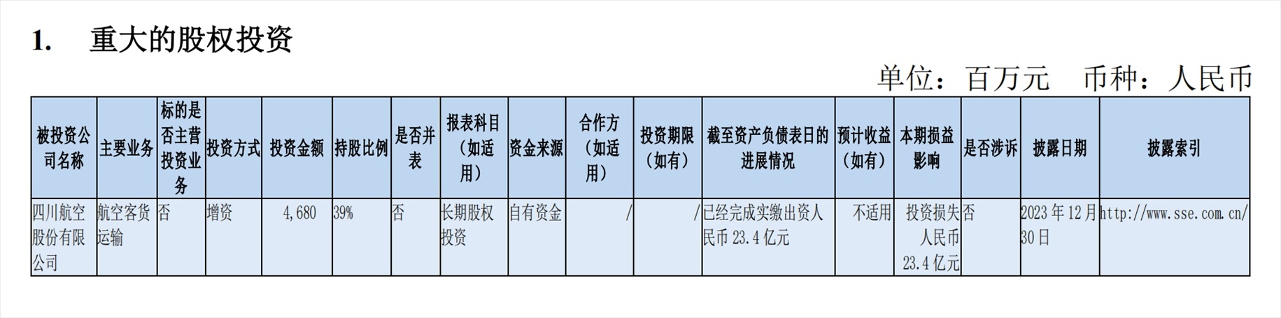 南方航空副董事長(zhǎng)、總經(jīng)理韓文勝在3月29日的業(yè)績(jī)說(shuō)明會(huì)上也提到,四川航空前期未確認(rèn)的損失自2021年6月開始形成,截至2023年12月31日增資當(dāng)期,確認(rèn)虧損23.4億元,尚未確認(rèn)26.6億元。投資損失產(chǎn)生的原因主要是疫情期間四川航空累計(jì)經(jīng)營(yíng)虧損,超出南航對(duì)四川航空的投資成本。