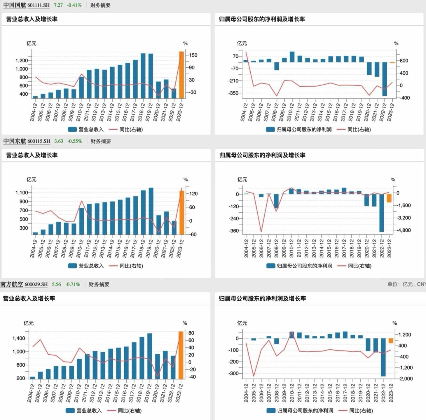 總體來(lái)看,三大航2023年業(yè)績(jī)集體仍未實(shí)現(xiàn)扭虧,但整體經(jīng)營(yíng)業(yè)績(jī)上有明顯改善,營(yíng)收均實(shí)現(xiàn)倍增恢復(fù)。去年前三季度業(yè)績(jī)亮眼,多項(xiàng)數(shù)據(jù)創(chuàng)新很高,但去年第四季度屬于傳統(tǒng)民航客運(yùn)淡季,其間不少航線價(jià)格都會(huì)環(huán)比大幅回落。具體來(lái)看航司業(yè)績(jī),南方航空去年?duì)I收最高,達(dá)到了1599.29億元,國(guó)航其次,營(yíng)收為1411億元,東航營(yíng)收為1137.41億元,分別同比增長(zhǎng)超八成、增超1.6倍、增超1.4倍。值得注意的是,其中國(guó)航和南航去年?duì)I收已創(chuàng)歷史新高。