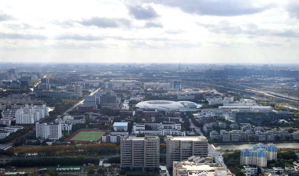 空中遠(yuǎn)望位于上海浦東新區(qū)張江科學(xué)城的形如鸚鵡螺的大科學(xué)裝置上海光源(中)(2023年11月25日攝,無人機(jī)照片)。新華社記者 方喆 攝