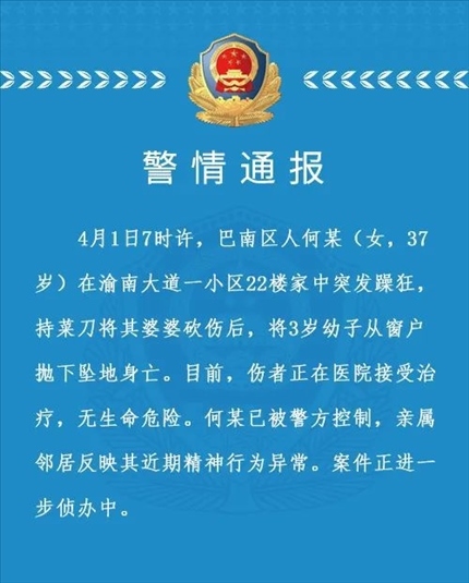 ·重慶一女子砍傷婆婆后將3歲幼子拋下樓致死,已被警方控制。鄰居稱女子高空拋?zhàn)忧岸啻胃呖諕佄?,知情人稱扔小孩母親避開了安全氣囊。