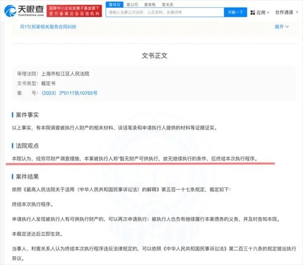 ·近日,演員鄭爽與海寧東開之星影視投資有限公司合同糾紛案件新增執(zhí)行裁定書。經(jīng)窮盡財(cái)產(chǎn)調(diào)查措施,法院認(rèn)定鄭爽無(wú)財(cái)產(chǎn)可供執(zhí)行。