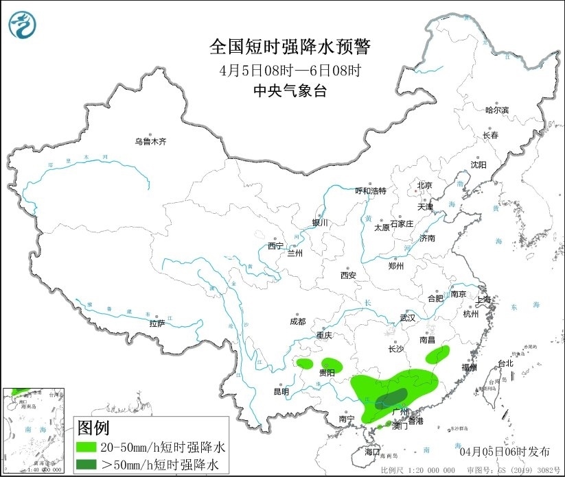 央視網(wǎng)消息:中央氣象臺4月5日06時發(fā)布強對流天氣藍色預(yù)警。預(yù)計4月5日08時至6日08時,江西南部、廣西東部、廣東中西部和北部等地的部分地區(qū)將有8級以上雷暴大風(fēng)或冰雹天氣;其中,廣西東北部、廣東中西部和北部等地的局地將有10級以上雷暴大風(fēng);另外,湖南南部、江西南部、福建西部、貴州西北部和中部、廣西東部、廣東中西部和北部等地的部分地區(qū)將有小時雨量大于20毫米的短時強降水天氣;其中,廣西東部和廣東中西部等地的局地最大小時雨量大于50毫米,個別地方可達80毫米以上。