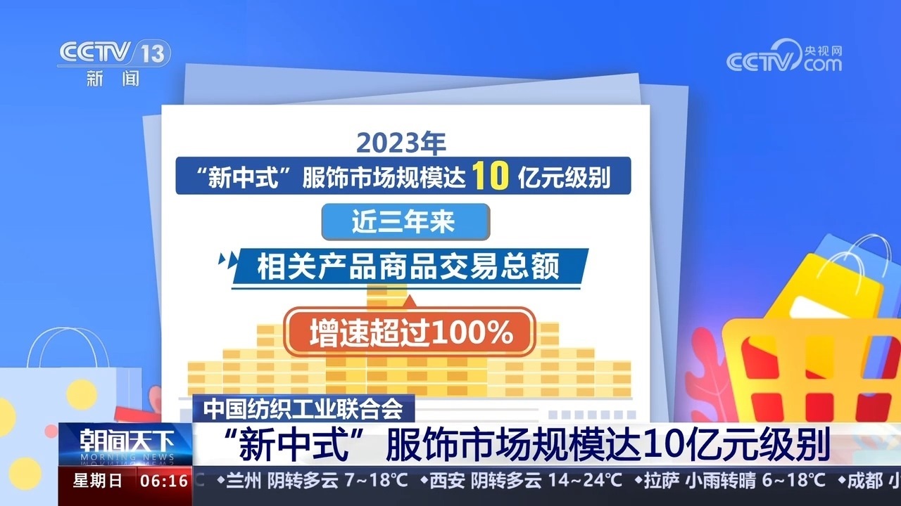 中國紡織工業(yè)聯(lián)合會數(shù)據(jù)顯示,2023年“新中式”服飾市場規(guī)模達10億元級別,近三年來,相關(guān)產(chǎn)品商品交易總額增速超過100%。今年1月以來,在互聯(lián)網(wǎng)銷售平臺上“新中式”“宋錦”的搜索量環(huán)比分別增長近6倍和近20倍。