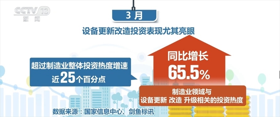 制造業(yè)領域則更為突出,1—2月,制造業(yè)投資熱度指數(shù)同比增長13.3%,3月迅速提升至40.6%,遠高于全國總體投資熱度增速。設備更新改造投資表現(xiàn)尤其亮眼,3月,制造業(yè)領域與設備更新、改造、升級相關的投資熱度同比增長65.5%,超過制造業(yè)整體投資熱度增速近25個百分點。