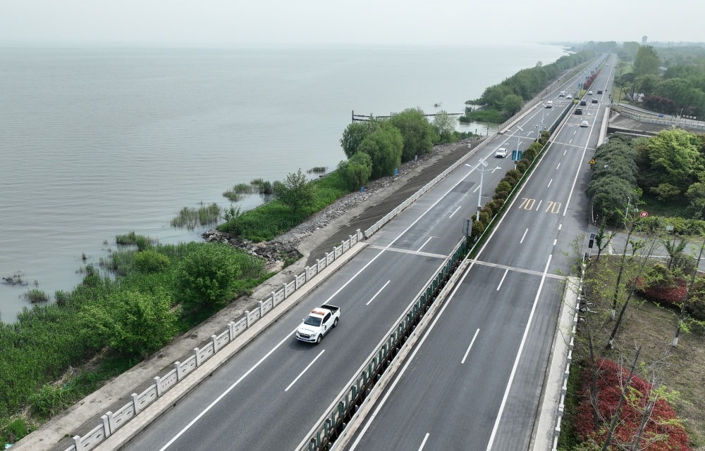 2024年4月11日,浙江省湖州市吳興區(qū)綜合行政執(zhí)法局高新區(qū)中隊執(zhí)法人員駕車在太湖沿岸巡查(無人機照片)。