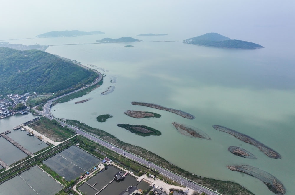 這是江蘇省蘇州市吳中區(qū)金庭鎮(zhèn)環(huán)太湖濕地帶修復項目(2024年4月11日攝,無人機照片)。