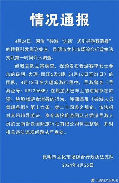 ·云南一導(dǎo)游“訓(xùn)話”式引導(dǎo)游客消費?當(dāng)?shù)赝▓螅簲M吊銷導(dǎo)游證。