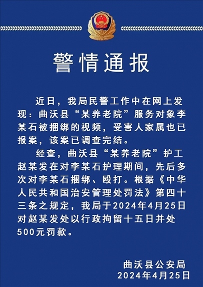 ·山西曲沃縣女子反映父親在一養(yǎng)老院遭捆綁疑被虐待,警方通報:涉事護(hù)工行拘15日并罰款。