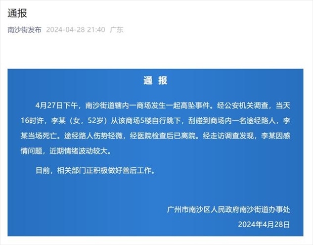 ·廣州一女子商場跳樓砸中路人,官方通報:跳樓者當(dāng)場死亡,路人傷勢輕微。