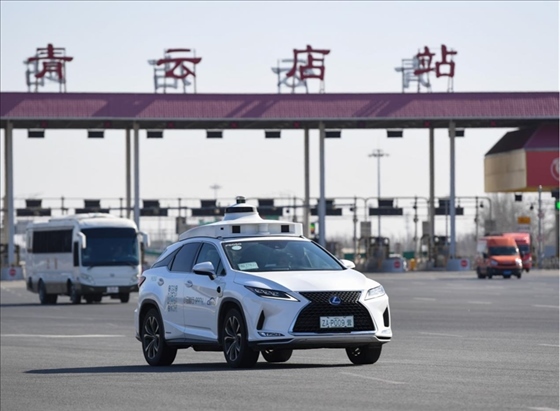 一輛自動(dòng)駕駛車行駛在北京大興國際機(jī)場(chǎng)到亦莊的自動(dòng)駕駛線路上(2024年3月1日攝)。新華社記者 鞠煥宗攝