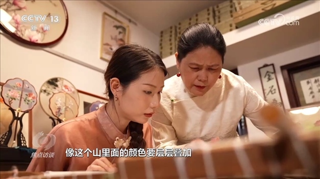 盧建英是蘇州當(dāng)?shù)赜忻奶K繡代表性傳承人。記者見(jiàn)到她的時(shí)候,她正在指導(dǎo)女兒刺繡。