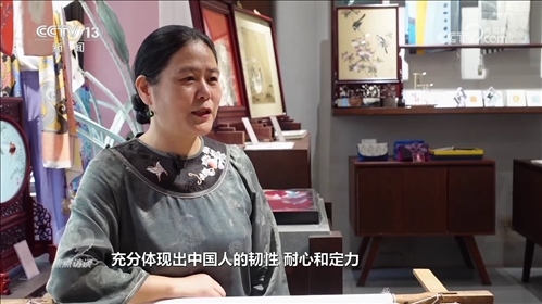 盧建英:“當(dāng)時(shí)我在繡一幅《桃花太平鳥(niǎo)圖》,習(xí)近平總書(shū)記走到了我的繃架前。他說(shuō)你好,很親切,很和藹,看得非常仔細(xì)。他說(shuō)中華文化的傳承力有多強(qiáng),通過(guò)這個(gè)蘇繡可以看出來(lái),像這樣的功夫充分體現(xiàn)出中國(guó)人的韌性、耐心和定力,這是中華民族精神的一部分,能得到總書(shū)記的認(rèn)可,真的是倍感榮耀?!?/p>