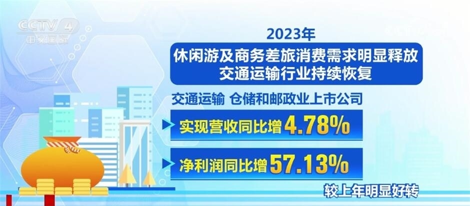 2023年,休閑游及商務差旅消費需求明顯釋放,交通運輸行業(yè)持續(xù)恢復,交通運輸、倉儲和郵政業(yè)上市公司實現(xiàn)營收、凈利潤同比增4.78%、57.13%,較上年明顯好轉(zhuǎn)。