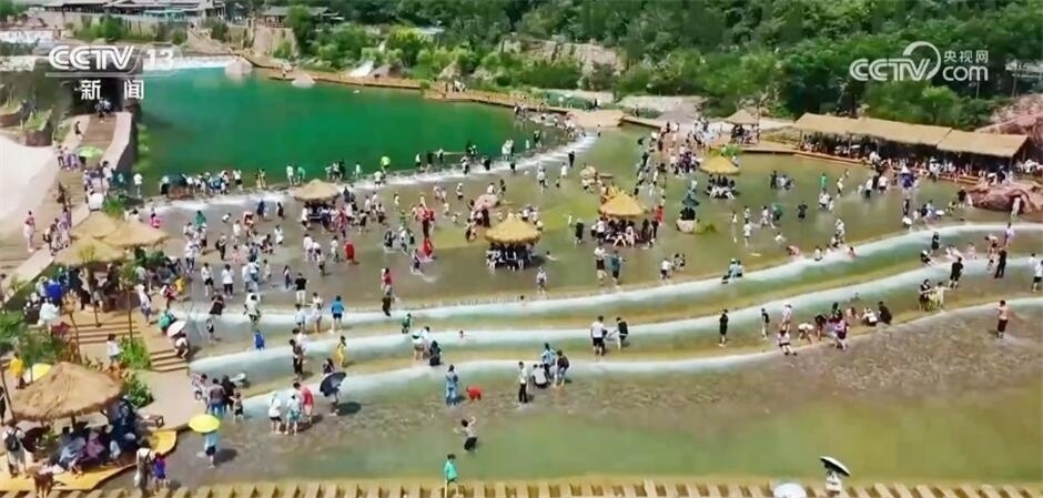 隨著氣溫漸高,越來越多的游客選擇走進峽谷,擼起褲管、光著腳丫走進淺灘中,搶先感受夏日清涼。在這里不僅能淺灘戲水,更能與落差近400米的飛瀑合影。大自然的鬼斧神工加上景區(qū)的創(chuàng)新舉措,為當?shù)芈糜螛I(yè)注入了新的活力,帶動了新一輪的消費熱潮。