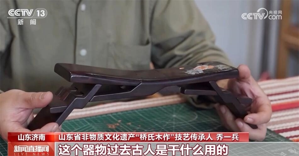 山東省非物質(zhì)文化遺產(chǎn)“橋氏木作”技藝傳承人喬一兵介紹:“它本身是一整塊木頭六個面,通過鋸和鑿形成一個器物。這個器物過去古人是干什么用的?當(dāng)枕頭用的,也可以當(dāng)?shù)首佑?,它最大的特點是可以折疊,攜帶非常方便,傳說是魯班發(fā)明的。和眾多的優(yōu)秀的傳統(tǒng)技藝一樣,它深層次代表的是中國的一些思想、一些哲學(xué)、一些文化在里邊,魯班枕的核心是平衡和和諧,我覺得我很有必要把它傳承下來,發(fā)揚(yáng)光大?!?/p>