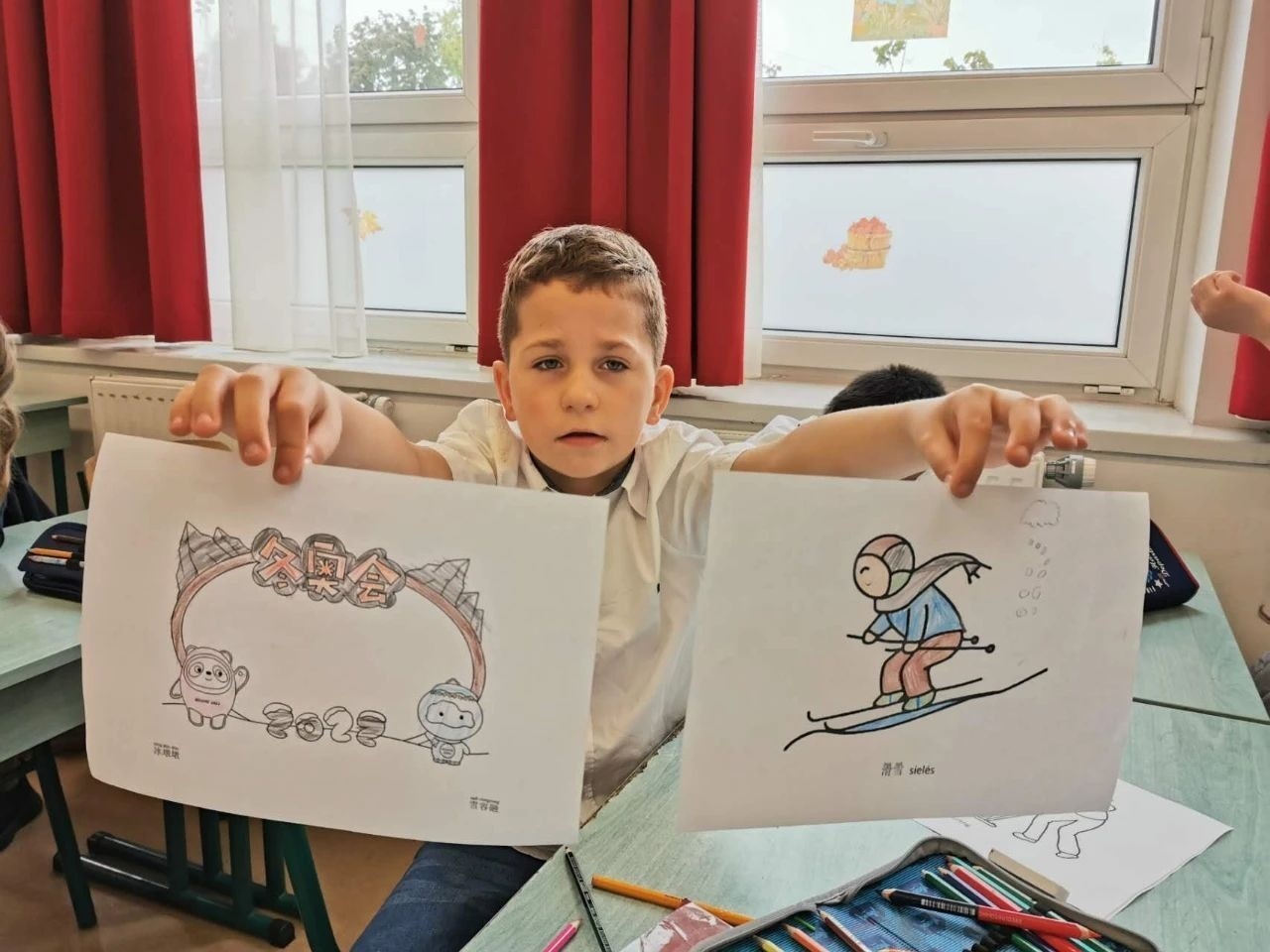 △匈中雙語(yǔ)學(xué)校學(xué)生展示具有冬奧元素的填圖畫 。