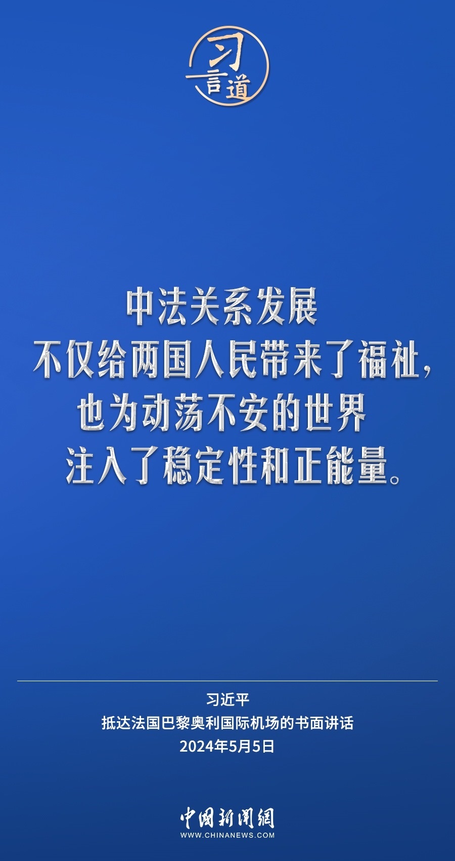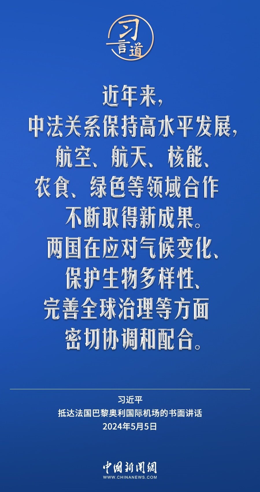 當(dāng)?shù)貢r(shí)間5月5日下午,國(guó)家主席習(xí)近平抵達(dá)巴黎,開(kāi)始對(duì)法國(guó)進(jìn)行國(guó)事訪問(wèn)。在抵達(dá)法國(guó)巴黎奧利國(guó)際機(jī)場(chǎng)的書(shū)面講話中,習(xí)近平指出——