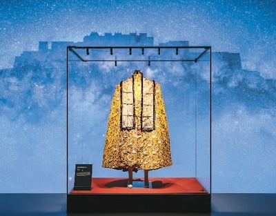 走進(jìn)展廳,在星空璀璨的布達(dá)拉宮夜景映襯下,一件金燦燦的斗篷格外引人注目。斗篷是西藏地區(qū)常見(jiàn)的服裝,根據(jù)場(chǎng)合和穿著對(duì)象的不同,斗篷的式樣和用料均有所差別。這件金寶地花卉紋斗篷通長(zhǎng)170厘米,黃綢緞上繡滿了花紋圖案,并鑲有多種珠寶,衣領(lǐng)上縫有獺皮,背后繡有云龍紋,可想而知穿著者身份之顯赫。此次展覽是它首次公開(kāi)展出。