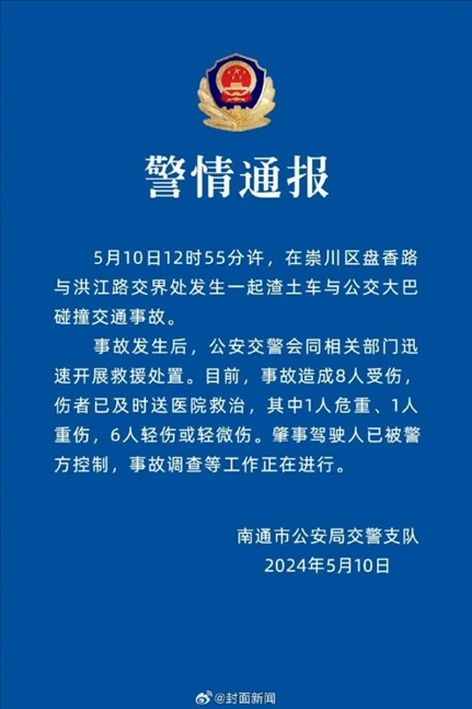 ·江蘇南通一大巴車與渣土車發(fā)生碰撞,警方通報:事故造成8人受傷,傷者已送醫(yī)救治。