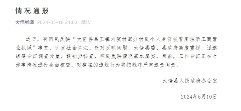 ·湖北大悟百余村民反映身份被冒用注冊個體工商戶,湖北大悟縣通報。