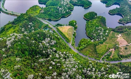 初夏時節(jié),浙江杭州,千島湖畔山坡上大片的桐花綻放,形成了五月“十里飛雪”的景觀,美不勝收。