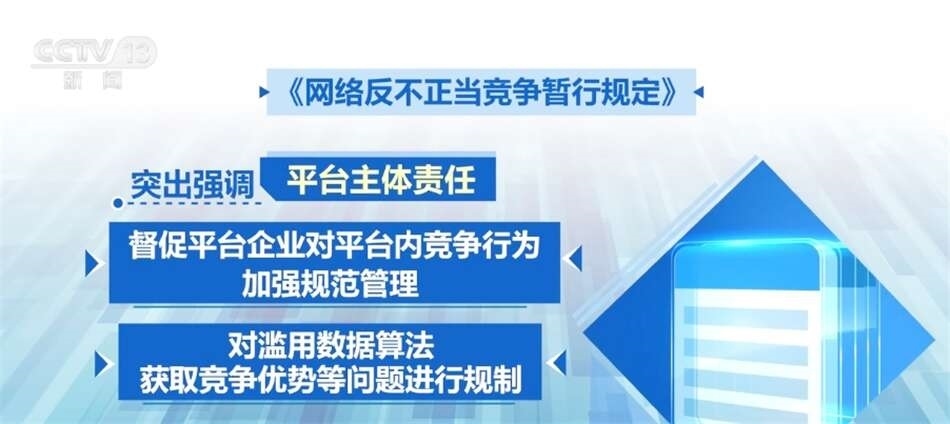 平臺企業(yè)掌握海量數(shù)據(jù),連接大量主體,既是網(wǎng)絡(luò)不正當(dāng)競爭監(jiān)管的重點對象,也是協(xié)同監(jiān)管的關(guān)鍵節(jié)點?!兑?guī)定》突出強調(diào)了平臺主體責(zé)任,督促平臺企業(yè)對平臺內(nèi)競爭行為加強規(guī)范管理,同時對濫用數(shù)據(jù)算法獲取競爭優(yōu)勢等問題進(jìn)行規(guī)制。