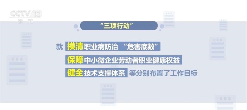 “三項行動”工作方案包括《職業(yè)病危害項目申報擴面行動(2024—2025年)工作方案》《中小微企業(yè)職業(yè)健康幫扶行動(2024—2025年)工作方案》《職業(yè)病防治機構(gòu)提質(zhì)合規(guī)行動(2024—2025年)工作方案》。