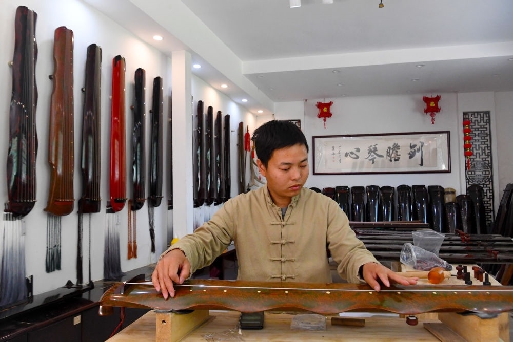 在堌陽鎮(zhèn)徐場村,沿街宅院里傳出打磨木材和動(dòng)聽的琴瑟之聲。尋聲踏入小院,“90后”琴師徐亞沖正撥動(dòng)琴弦,調(diào)試古琴?!爸魄俨粌H是我們致富的門路,彈琴已成為我們的新生活方式?!?/p>