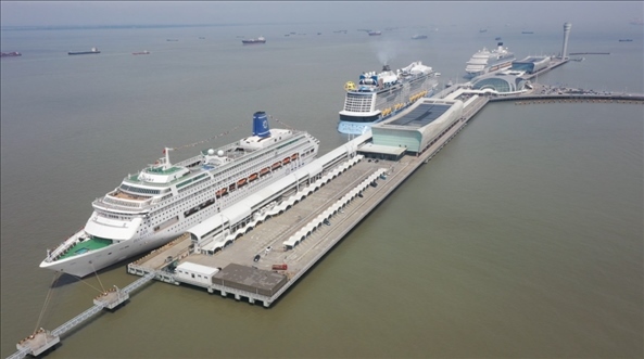 5月22日,“愛達(dá)·魔都號”“海洋光譜號”和“鼓浪嶼號”三艘郵輪??吭趨卿量趪H郵輪港(無人機(jī)照片)。(上海邊檢總站供圖)