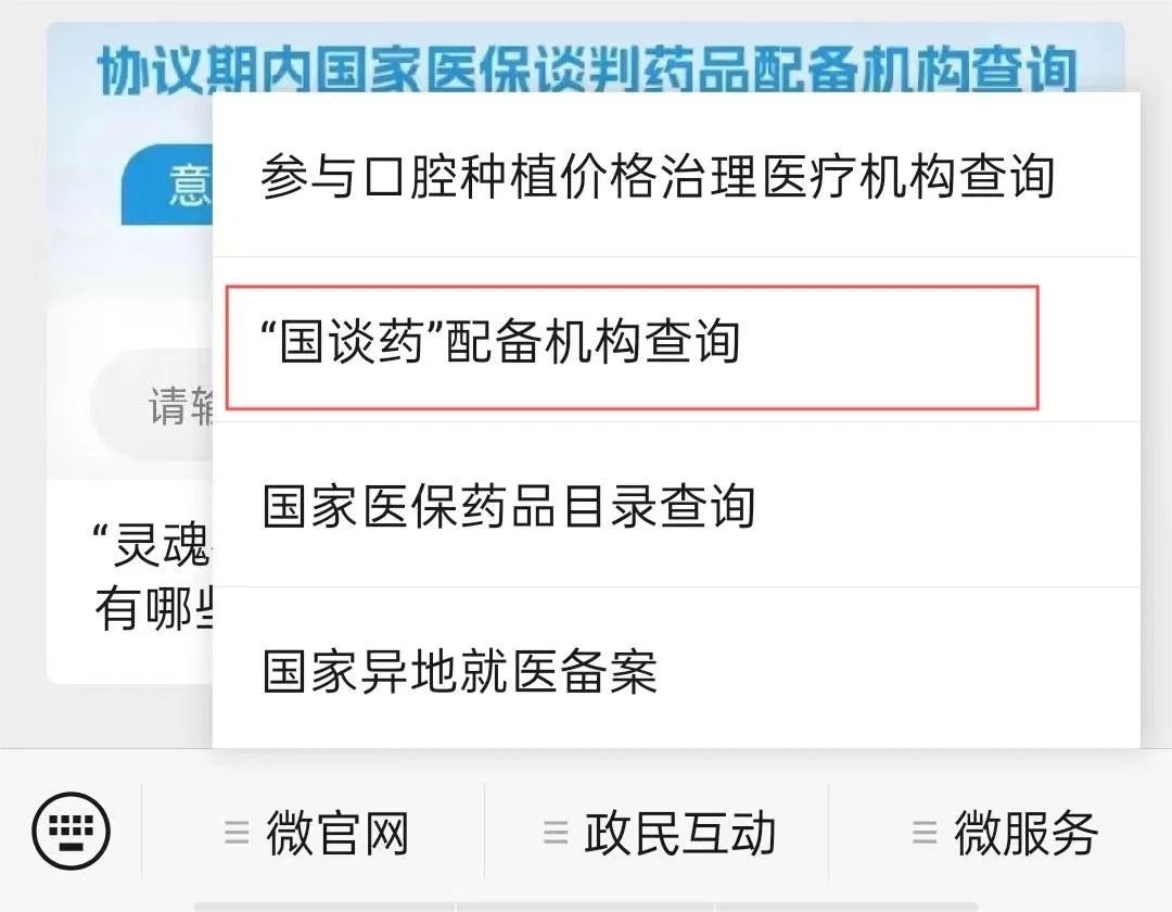 第一步:進(jìn)入“國(guó)家醫(yī)保局”微信公眾號(hào),點(diǎn)擊微服務(wù)→“國(guó)談藥”配備機(jī)構(gòu)查詢,進(jìn)入查詢頁面。