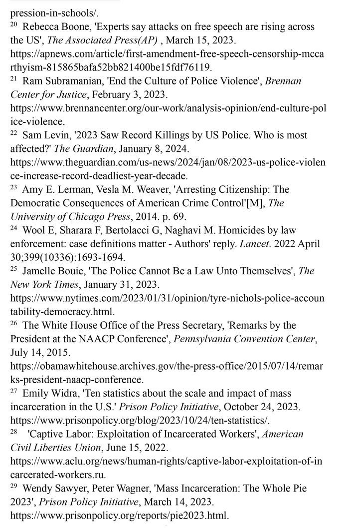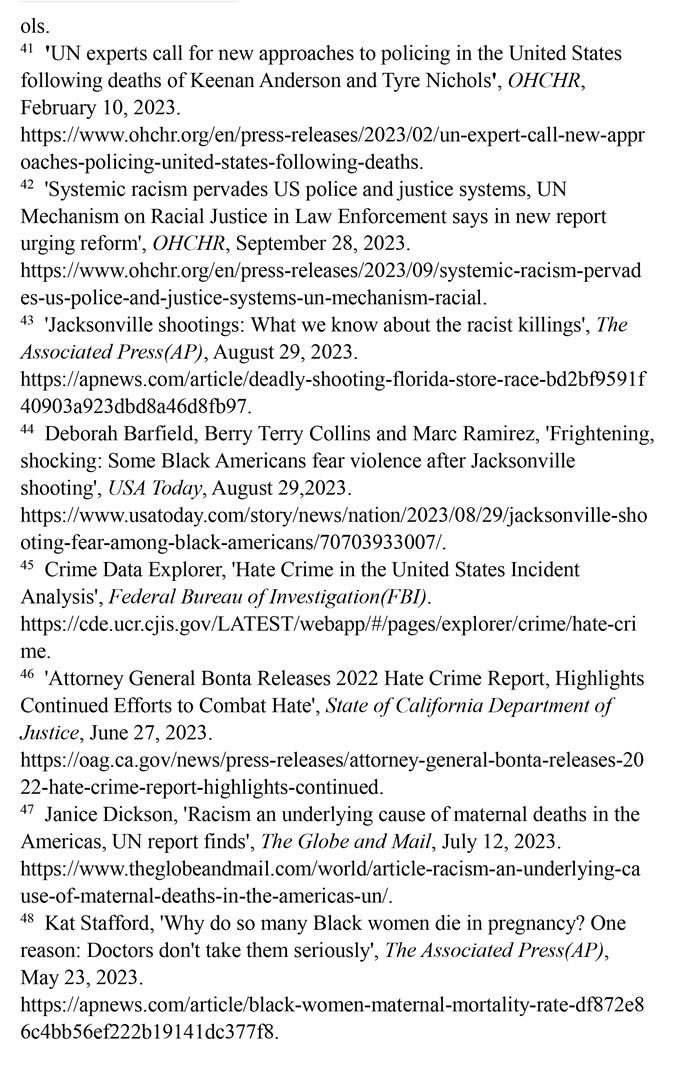 非洲裔在執(zhí)法領(lǐng)域面臨嚴重種族歧視。2023年1月3日,洛杉磯31歲的非洲裔男子基南·安德森涉嫌交通肇事,警方在制服他的過程中使用電擊槍擊中其6次,致其心臟病發(fā),送醫(yī)不治身亡。(注39)2023年1月7日,田納西州孟菲斯市的警察以“魯莽駕駛”為由將29歲的非洲裔男子泰爾·尼科爾斯攔下,并對其進行長達數(shù)分鐘的殘忍毆打。三天后尼科爾斯因傷勢過重去世,而事后的調(diào)查無法證實警察關(guān)于其“魯莽駕駛”的說法。(注40)這兩起非洲裔遭受警察暴力執(zhí)法身亡案例引發(fā)多名聯(lián)合國專家的高度關(guān)注。專家們強調(diào),在兩起事件中,警察使用的武力違反保護生命權(quán),禁止酷刑和其他殘忍、不人道或有辱人格待遇或處罰的國際準則,也不符合聯(lián)合國《執(zhí)法人員行為守則》和《執(zhí)法人員使用武力和火器的基本原則》。(注41)聯(lián)合國人權(quán)理事會在執(zhí)法工作中推進種族正義和平等的國際獨立專家機制在對美國實地訪問后發(fā)布報告指出,針對非洲裔的系統(tǒng)性種族主義已經(jīng)滲透到美國警察隊伍和刑事司法系統(tǒng)。非洲裔被警察殺害的可能性是白人的3倍,被監(jiān)禁的可能性是白人的4.5倍。在每年1000多起警察殺人案件中,只有1%的涉事警察被指控。報告警告說,美國如果不按照國際標準改革警察使用武力的規(guī)則,許多殺戮將繼續(xù)發(fā)生。(注42)