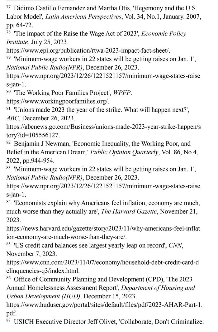 “工作者貧困”問題突出。美國勞動力市場狀況發(fā)生了結(jié)構(gòu)性變化,低薪崗位和缺乏監(jiān)管普遍存在。(注77)有大批“工作窮人”終日勞作,其工資水平卻難以維持基本生計,還缺乏應有的社會保障。美國聯(lián)邦最低時薪標準自2009年以來一直沒有上調(diào)。(注78)美國勞工部的數(shù)據(jù)顯示,2023年仍有20個州維持聯(lián)邦最低時薪標準。(注79)美國有1150萬個低收入工薪家庭,包括1480萬兒童在內(nèi)的2990多萬美國人生活在這些低收入工薪家庭。(注80)勞資收入增長懸殊導致多行業(yè)大面積罷工。2023年,美國發(fā)生了21世紀以來波及范圍最廣的罷工潮,包括影視、制造、醫(yī)療、媒體在內(nèi)的多個行業(yè)都出現(xiàn)大規(guī)模罷工。(注81)加利福尼亞州大學公共政策與政治學院副教授本杰明·紐曼評論稱,陷入結(jié)構(gòu)性貧困之中的“工作窮人”既缺乏機會平等,也難以向上流動,他們極大地降低了對“美國夢”的信念。(注82)