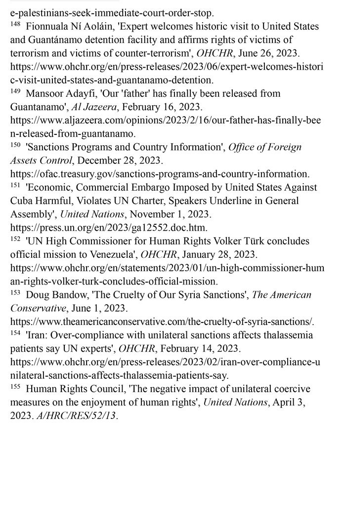 長期濫施單邊制裁造成嚴重人道主義后果。自1950年以來,美國使用的制裁次數(shù)居全球之首。根據(jù)美國財政部2023年12月28日公布的數(shù)據(jù),美國制裁的國家超過20個。(注150)第78屆聯(lián)合國大會發(fā)言人2023年11月1日指出,美國對古巴實施的經(jīng)濟、商業(yè)和金融封鎖違反了《聯(lián)合國憲章》,對古巴人民造成了毀滅性影響。(注151)聯(lián)合國大會2023年11月2日通過決議,再次敦促美國終止對古巴長達60多年的經(jīng)濟、商業(yè)和金融封鎖,這是聯(lián)合國大會連續(xù)第31年通過類似決議。2023年1月28日,聯(lián)合國人權(quán)事務高級專員沃爾克·圖爾克在訪問委內(nèi)瑞拉后表示,2017年以來美國施加的制裁加劇了委內(nèi)瑞拉的經(jīng)濟危機,嚴重阻礙人權(quán)的實現(xiàn)。(注152)“美國保守派”網(wǎng)站2023年6月1日報道,美國制裁進一步加劇了敘利亞人民的貧困。敘利亞70%的人口面臨食物短缺,其中1200萬人三餐不繼,290萬人食不果腹。(注153)聯(lián)合國人權(quán)理事會單邊強制措施對人權(quán)負面影響問題特別報告員阿萊娜·杜晗2023年2月14日指出,美國對伊朗的制裁減少了地中海貧血癥患者從國外進口救命藥物的機會,導致伊朗患者的并發(fā)癥和死亡率增加,是對健康權(quán)的侵犯。(注154)聯(lián)合國人權(quán)理事會2023年4月3日通過決議指出,單邊強制性措施會對目標國家廣大民眾的人權(quán)產(chǎn)生深遠影響,對窮人和處境最脆弱的人影響尤為嚴重。決議譴責某些大國繼續(xù)單方面適用單邊強制性措施。美國在該決議表決中投了反對票。(注155)