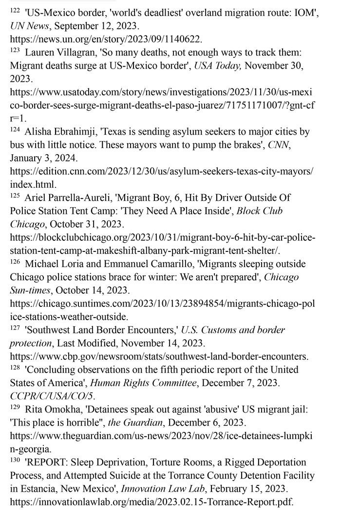 入境移民遭受酷刑及其他不人道待遇。2023財年,在美國南部邊境遭逮捕或驅(qū)逐的移民總數(shù)達240多萬人,再創(chuàng)歷史新高。(注127)聯(lián)合國人權(quán)事務委員會對移民在美國受到長時間的拘留表示擔憂,批評美國的拘留所條件惡劣,人滿為患,被拘押者無法獲得食物、水和醫(yī)療服務,導致包括兒童在內(nèi)的許多人死亡;公共和私營移民拘留設施存在性暴力、長期單獨監(jiān)禁、虐待等侵犯人權(quán)問題。(注128)英國《衛(wèi)報》網(wǎng)站2023年12月6日報道,由美國私人監(jiān)獄公司CoreCivic運營的、位于佐治亞州蘭普金的斯圖爾特拘留中心存在長期單獨監(jiān)禁、性虐待、醫(yī)療疏忽以及強迫勞動等令人擔憂的問題。(注129)創(chuàng)新法律實驗室于2023年2月15日發(fā)布報告揭露,由CoreCivic運營的、位于新墨西哥州埃斯坦西亞的托蘭斯縣拘留所存在對被關(guān)押者實施酷刑現(xiàn)象。在夜間,每隔15分鐘就會有一名警衛(wèi)開著收音機的最大音量走過這些房間,大聲地敲著門,并用手電筒強光照進房間,吵醒任何可能睡著的人。在寒冷的天氣里,每個房間的通風管道整夜都在吹冷空氣。一些人試圖用衛(wèi)生紙或毯子蓋住通風口,但警衛(wèi)們拿走了用來阻擋冷空氣的任何東西。這些牢房里,廁所污水和糞便溢出,人們被迫睡在臭氣熏天的地板上。(注130)